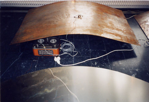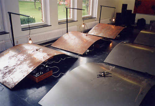 Mottagning (Reception) By means of eight metal plates, eight voices and two performers, to make reception conditions as felicitous as possible at the Museum over a period of one hour. This version of RECEPTION is designed for Norrköpingskonstmuseum. It makes use of eight sound-generating 2x3.1 m iron plates, and eight voices from different directions and different ages. Our mission is to create over a four-hour period conditions favouring the occurrence of a miracle. |